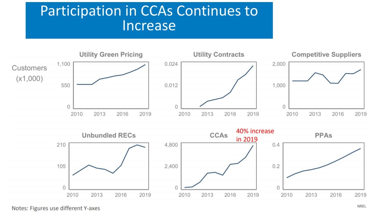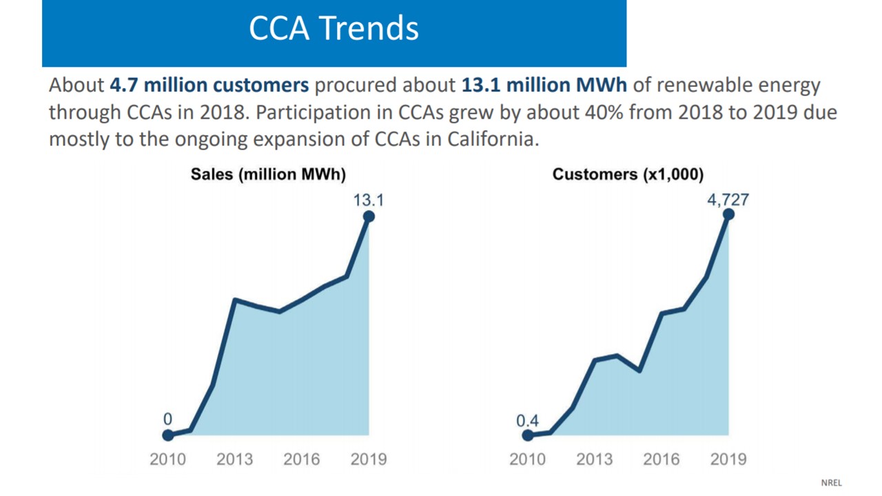 cca发挥着关键作用。NREL报告称,2018年,约470万CCA客户通过CCAs购买了约1310万兆瓦时的可再生能源,而NREL的初步数据显示,从2018年到2019年,CCA的参与度估计增加了40%。